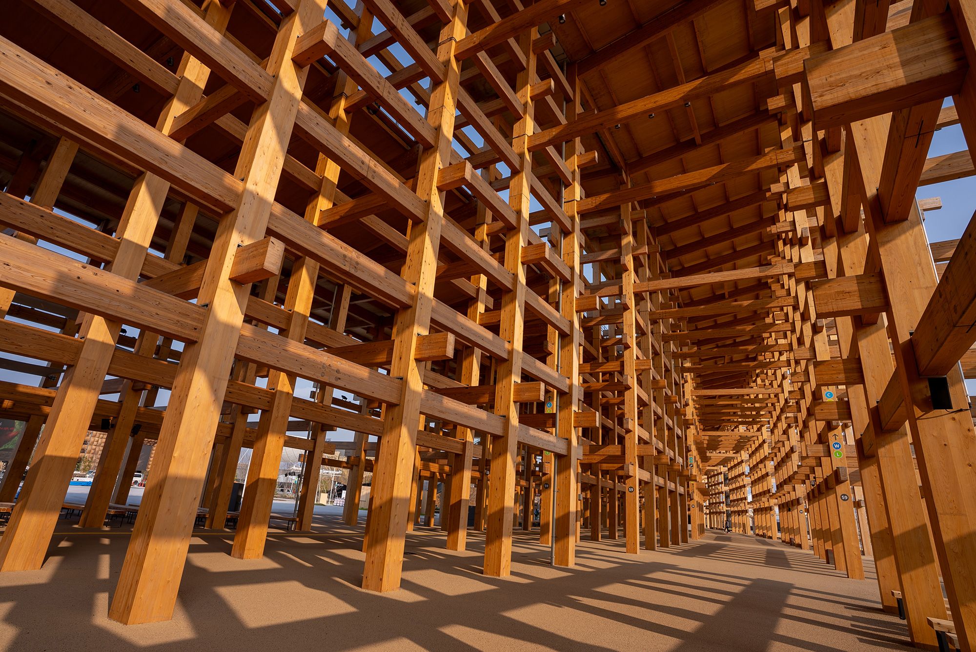One of the most striking features of the Expo site is the Grand Roof Ring, a massive wooden pedestrian walkway approximately 2 kilometers long, 12–20 meters high, and 30 meters wide. It loops around the venue, partially extending over water and connecting most of the zones and pavilions.